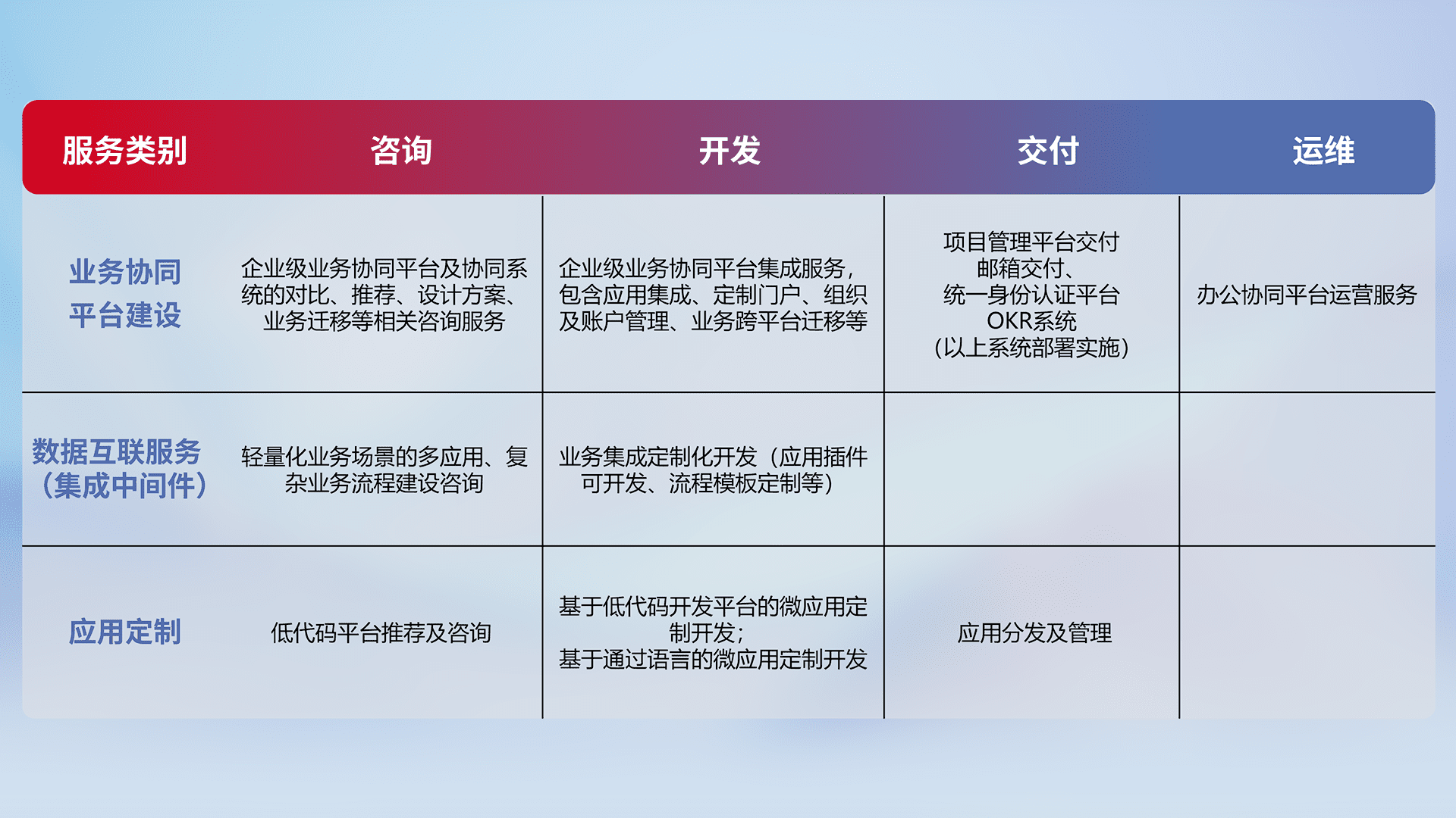 针对钉钉、、、、企微、、IDaas等平台级产品提供产品的规划、、、方案、、、交付、、、、定制化开发等服务,,,实现如统一协同办公、、、、智能客户服务、、、混合会议管理、、智能数据查询、、等业务场景,,,,实现数字化转型。。。。